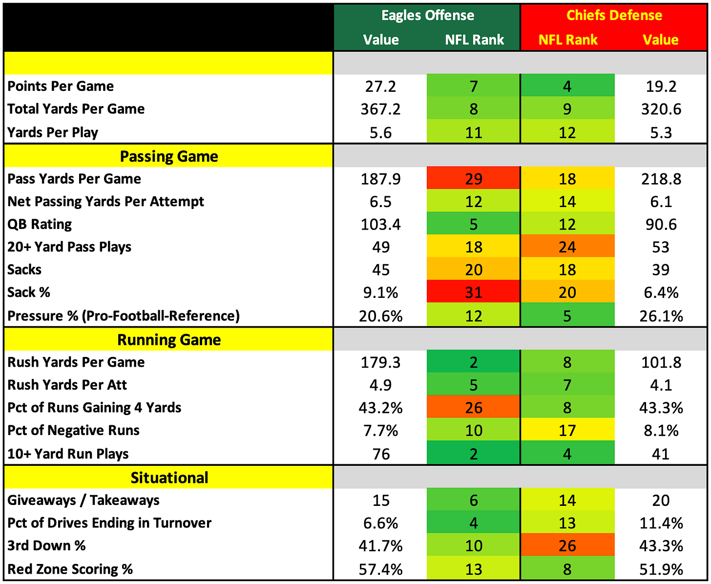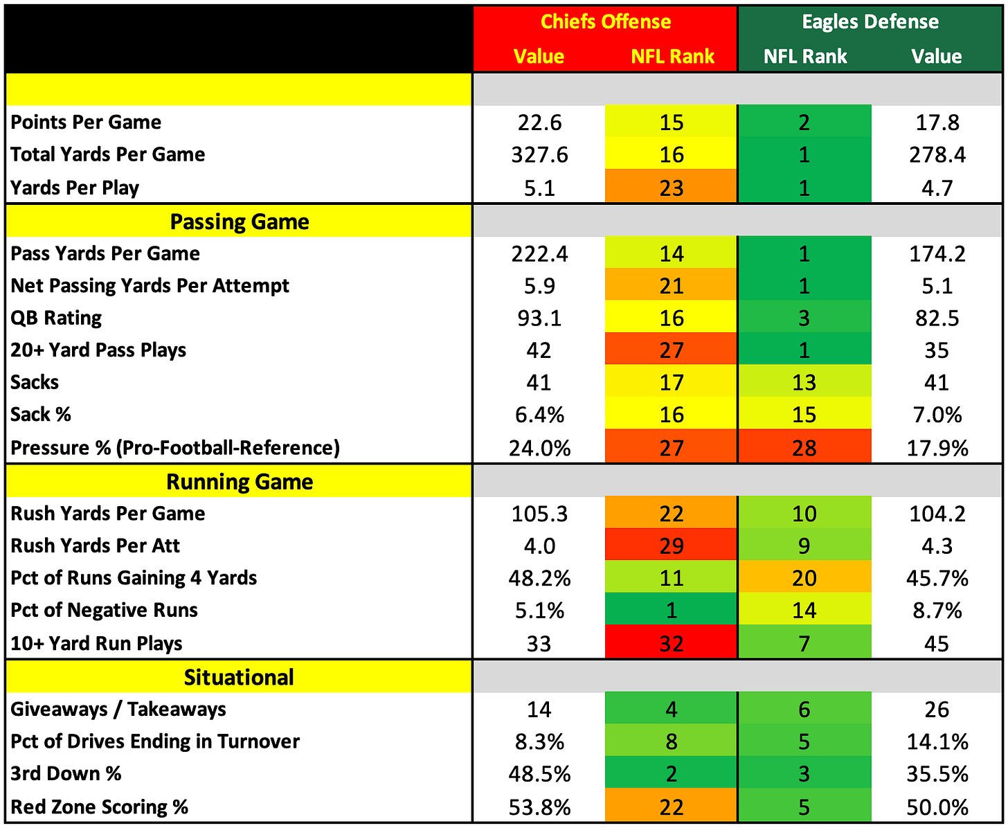 It’s hard to believe the Chiefs’ run game will be a factor. They ranked 29th in yards per attempt and dead last in 10-yard runs. The Eagles defense ranked 9th and 7th respectively. Although Andy Reid does have ways to manufacture big runs in key situations.