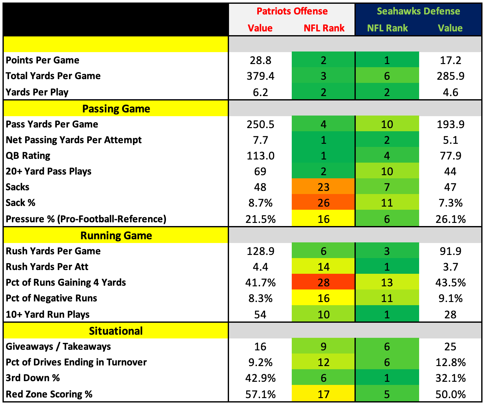 This is a strength-on-strength matchup. The Patriots offense ranked 2nd in points and 2nd in yards per play this season. The Seahawks defense ranked 1st in points and 2nd in yards per play allowed.