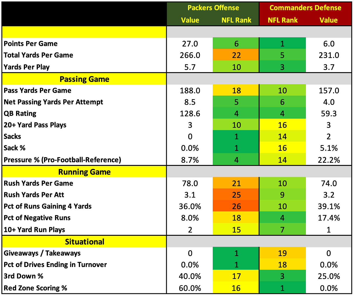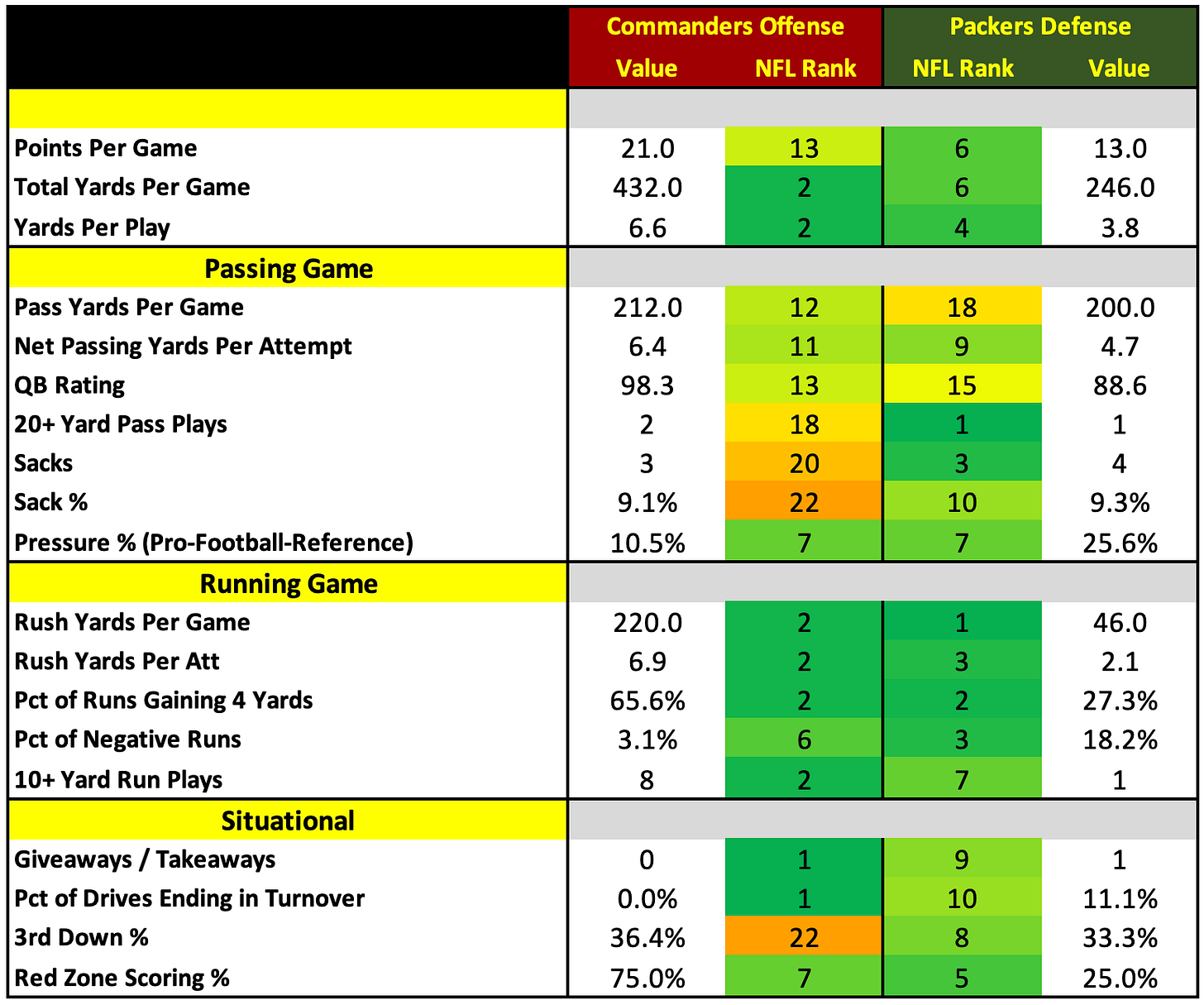 Here’s a look at tonight’s Thursday Night Football Game between the Commanders and Packers based on last week’s numbers. The sample size is certainly small at this point in the season, but it won’t take long for these numbers to become representative of team identities.