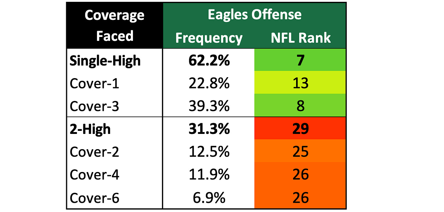 of MatchQuarters, defenses tended to shy away from 2-high coverages against the Eagles, opting instead to play more single-high:More single-high coverage means more 1-on-1 matchups on the outside where Hurts is at his best. And that’s where he has the receivers in A.J. Brown and DeVonta Smith to scare any defense: