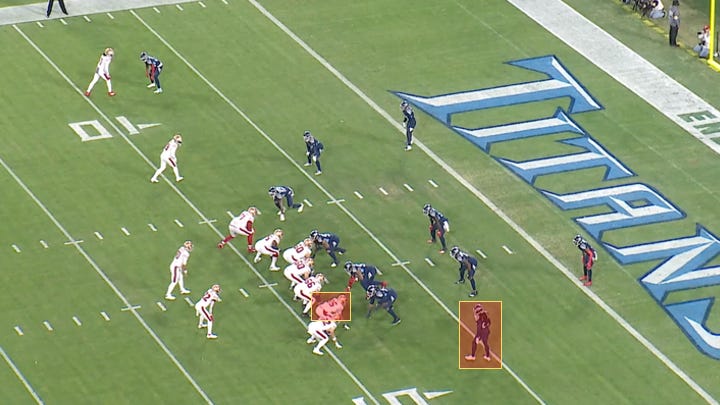 Leading 7-0 in the first quarter, San Francisco had the chance to take over the game. Shanahan dialed up a play meant to isolate tight end George Kittle (6’4”) on a smaller cornerback, Janoris Jenkins (5’10”):