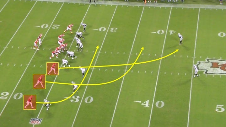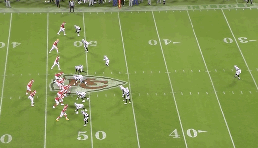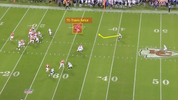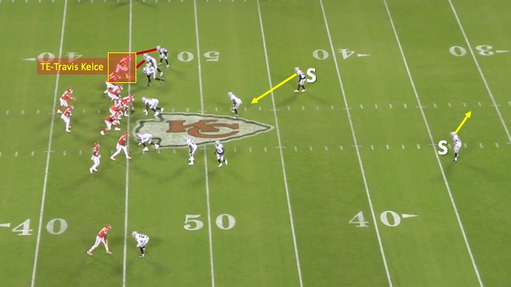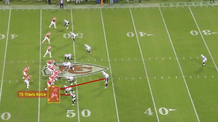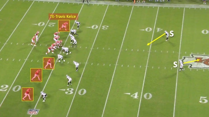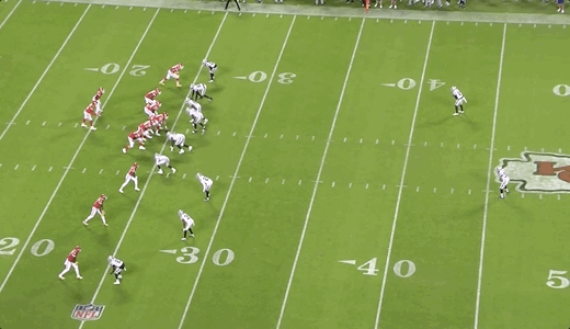 The Raiders tried to have the best of both worlds as the help defender appeared to bluff like he would be moving into the middle of the field to take away those in-breaking routes. Then he moved towards Kelce: