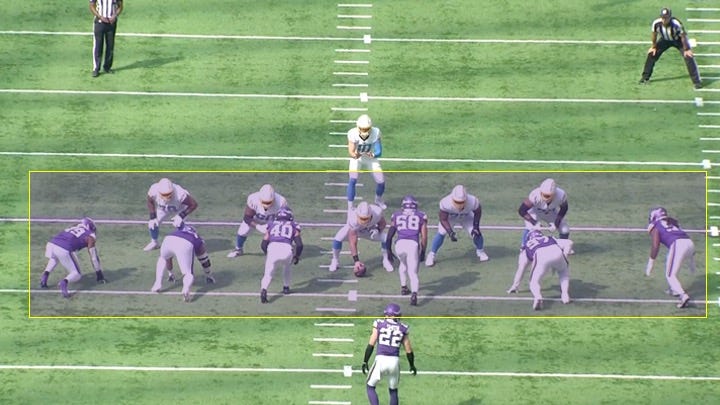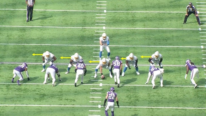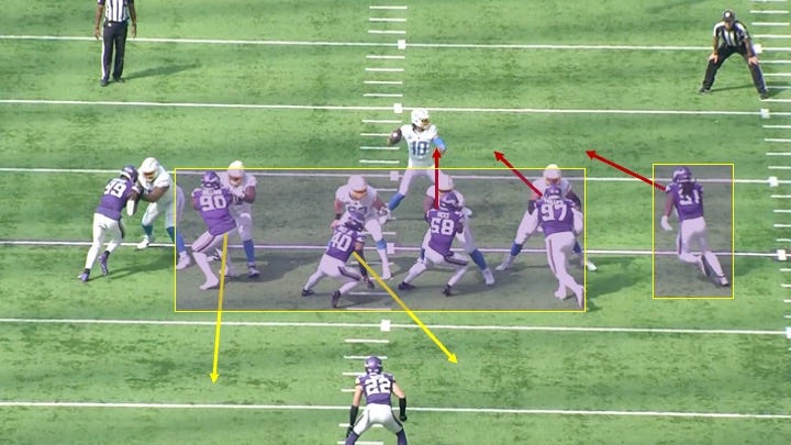At its core, the scheme is designed to waste blockers in protection, create free rushers, or generate huge mismatches. Here’s a quick example from early in the game on Sunday. You can see that the Vikings had 6 potential pass rushers on the line of scrimmage against the Chargers’ empty formation (just 5 blockers):