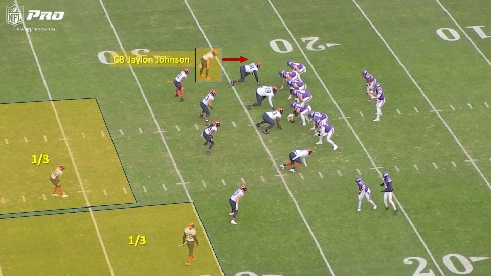 Sure enough, the Bears were aligned in cover-3 and were playing “tight down into the boundary” with cornerback Jaylon Johnson hanging close to the line of scrimmage: