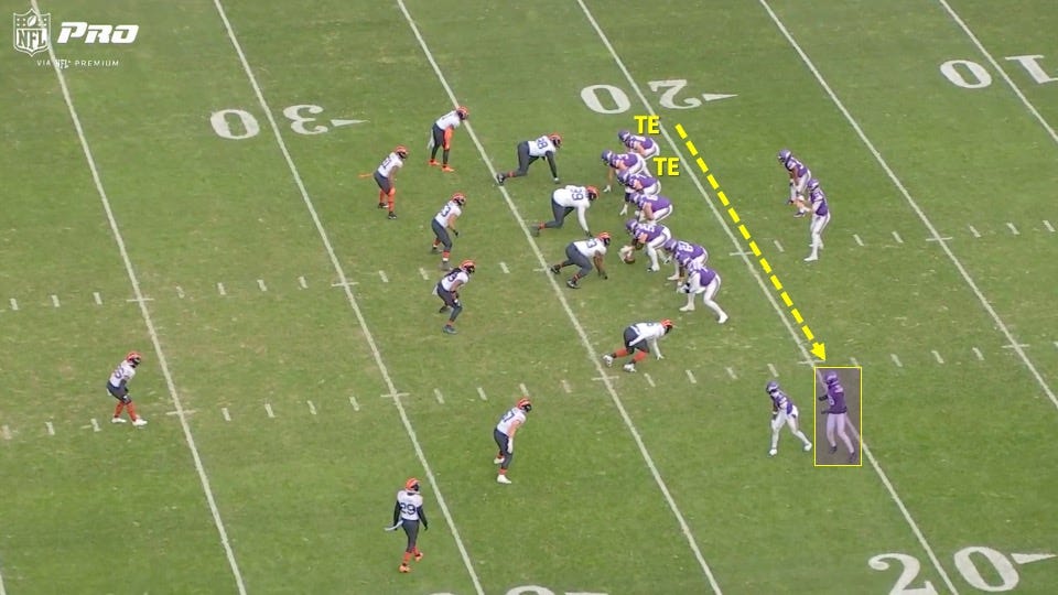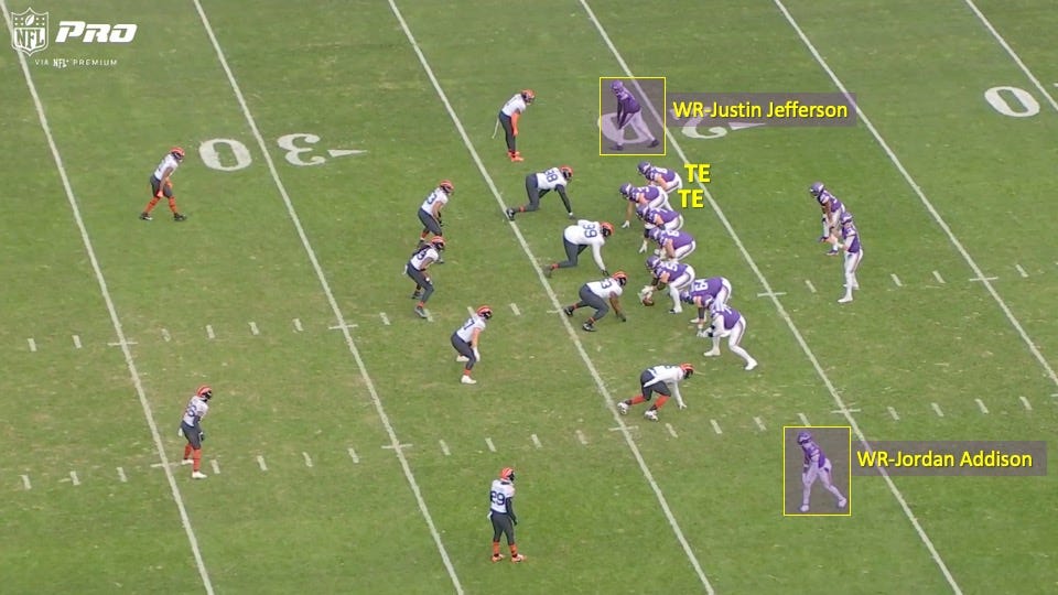 Minnesota started in a 3x1 formation with Justin Jefferson and two in-line tight ends to one side and Jordan Addison to the other: