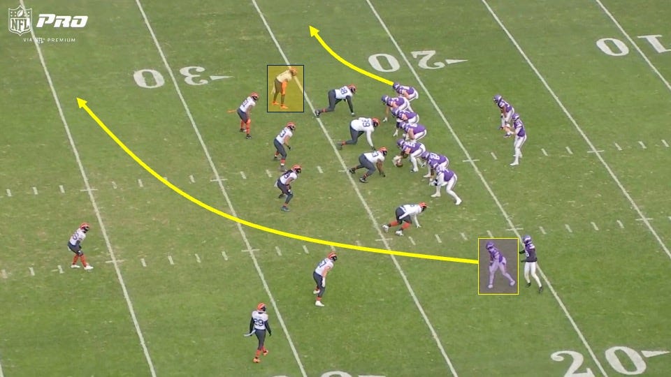 So the Vikings attacked with a deep over by Jordan Addison from the other side of the field that would finish behind Johnson. Then they held him with a flat route from one of those tight ends: