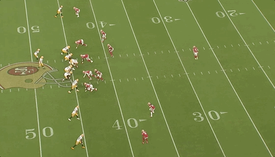 When these teams played in Week 3, the Packers often utilized chips to help limit the 49ers’ pass rush off the edge when they wanted to push the ball downfield. Watch tight end Josiah Deguara (#81) on the left side of the screen here: