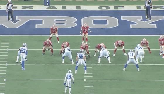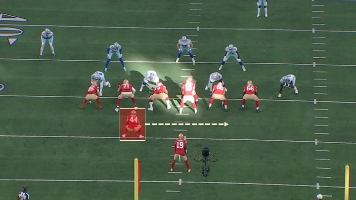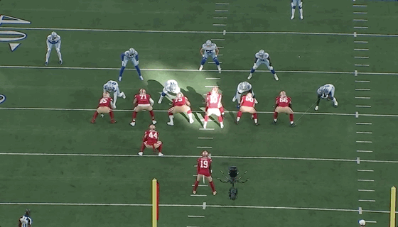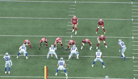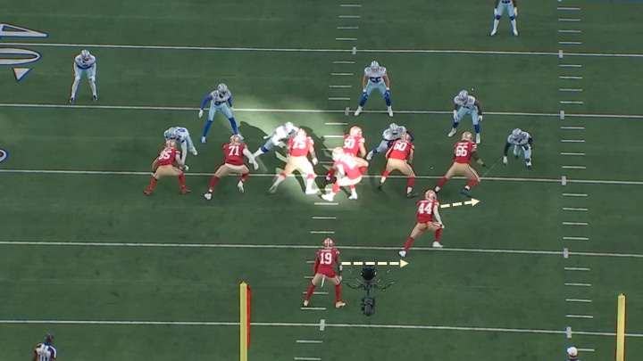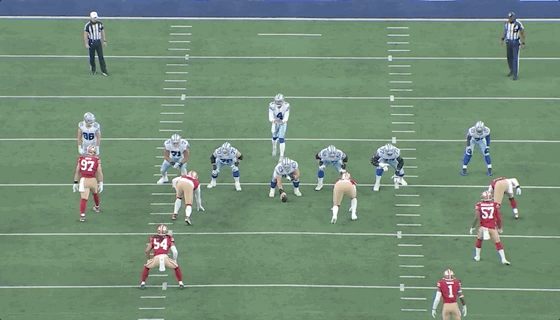 However, Juszczyk reversed direction back to the left after the snap and Samuel cut upfield immediately. The Cowboys entire D-line got caught in the wash, a combination of reacting to the toss action and getting beat physically up front: