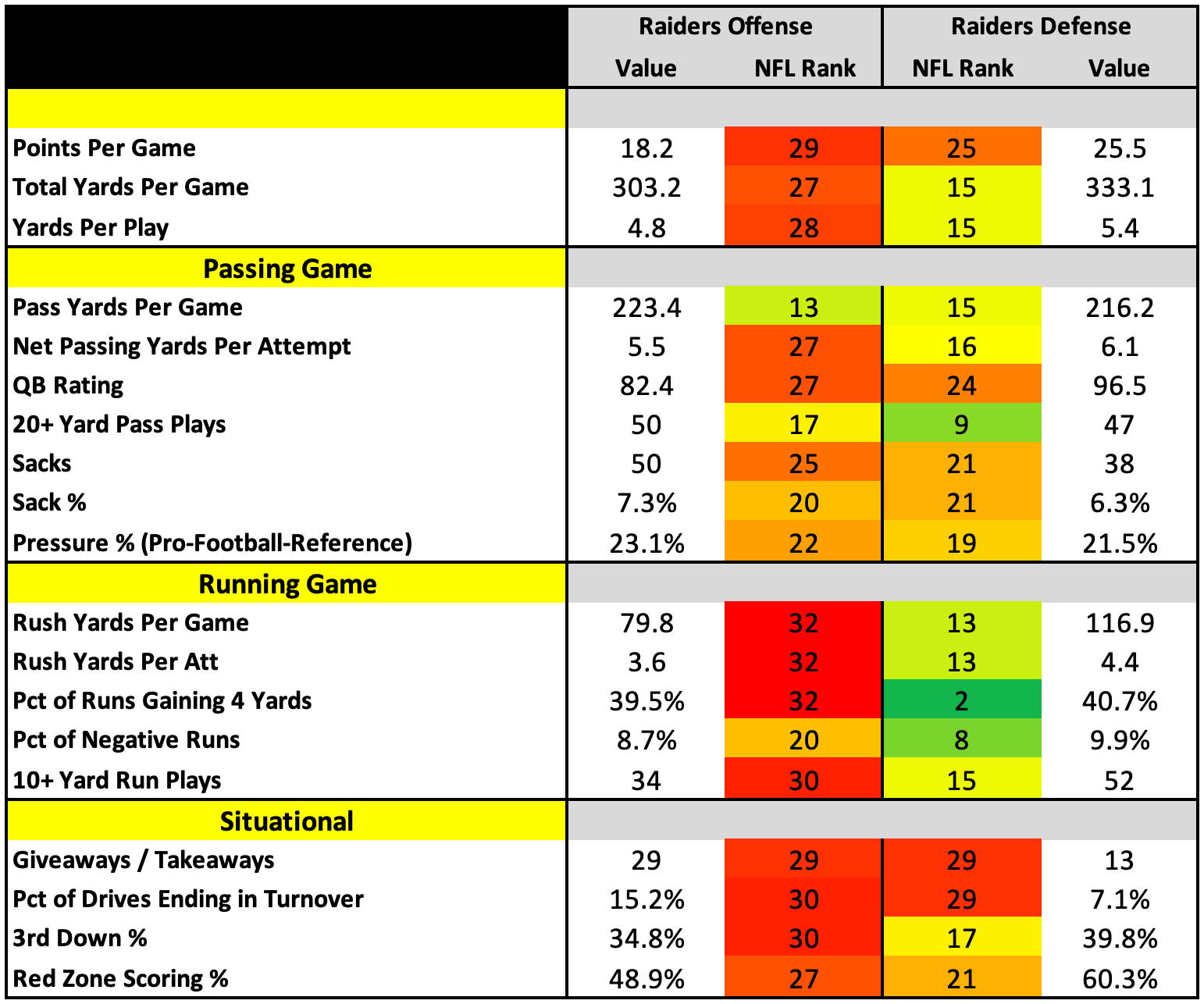 From the numbers above, you can see the impact that ineffectiveness at the most important position can have on an offense. The Raiders ranked 29th in giveaways, 30th on 3rd down, and 27th in red zone offense last season. All of those are directly tied to the abilities and performance of the quarterback.