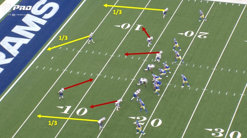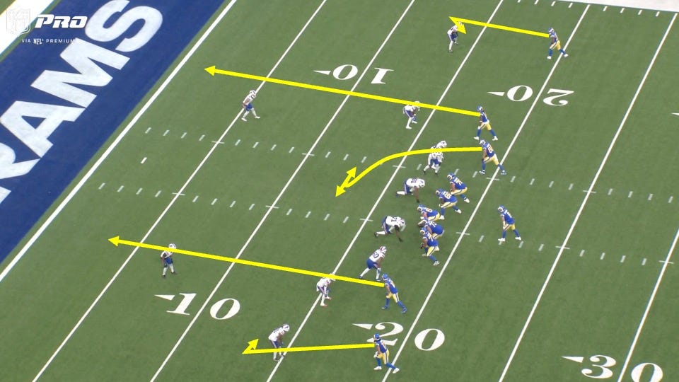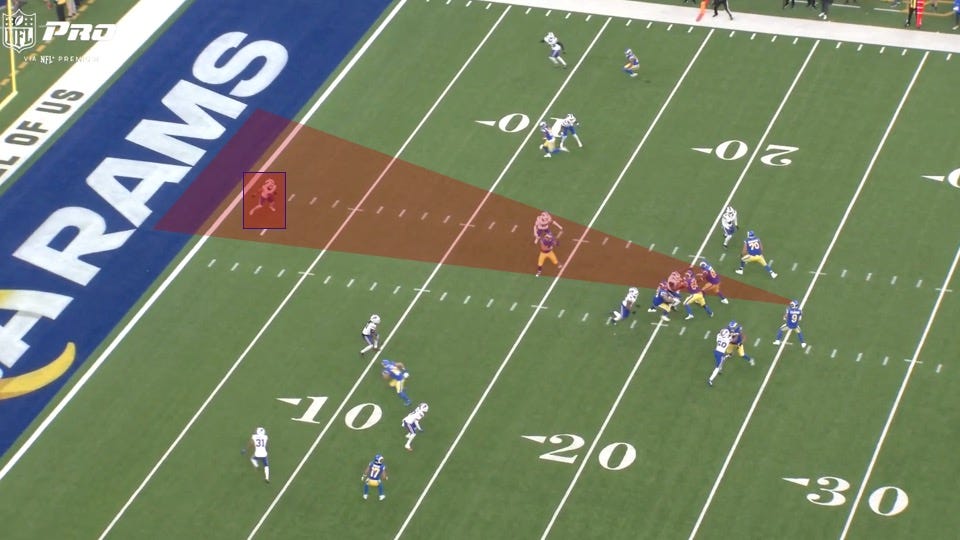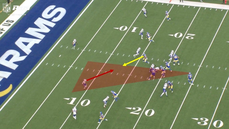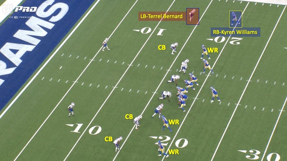 The Rams came out in an empty formation and put running back Kyren Williams on the outside. The Bills would match up with a linebacker over him and cornerbacks on L.A.’s receivers elsewhere, all indicators of man coverage:
