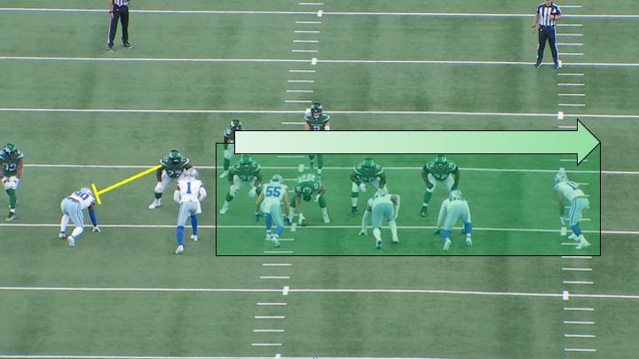 This got the offense to use a 4-man slide to its left to account for those 3 D-linemen and Vander Esch:
