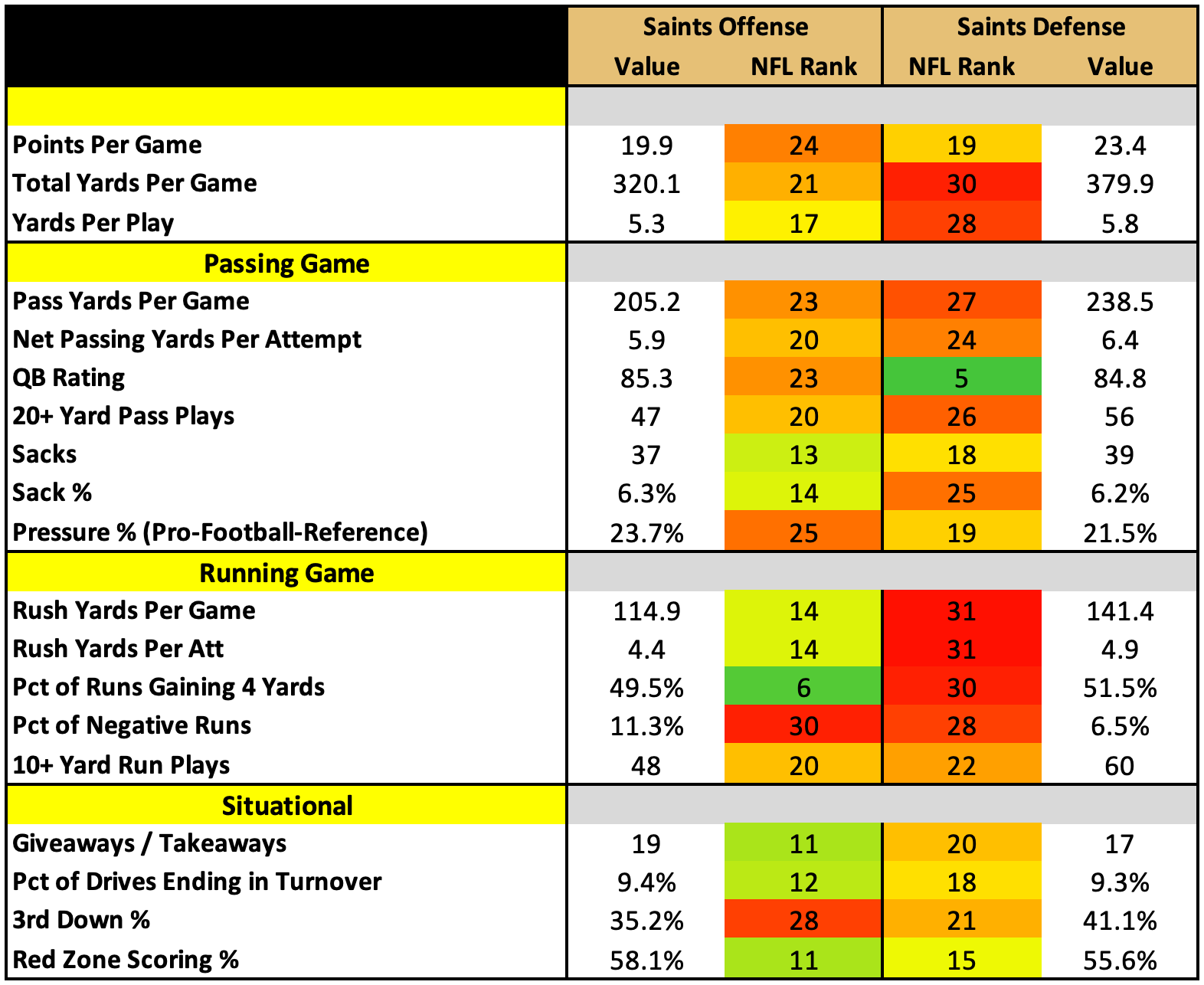 One of the other big questions the Saints will have to answer is where their pass rush will come from. It was a subpar area of the team last year (19th in pressure percentage and 25th in sack percentage). And they really didn’t make any substantial moves this offseason.