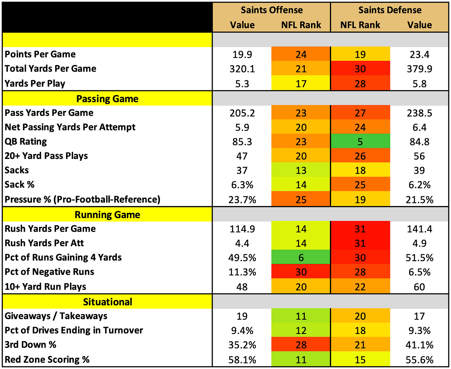 The Saints are just a huge question mark as a whole. New head coach. New offensive system. New defensive coordinator. New quarterback. But they do have decent talent on both sides of the ball.
