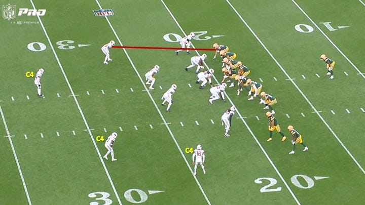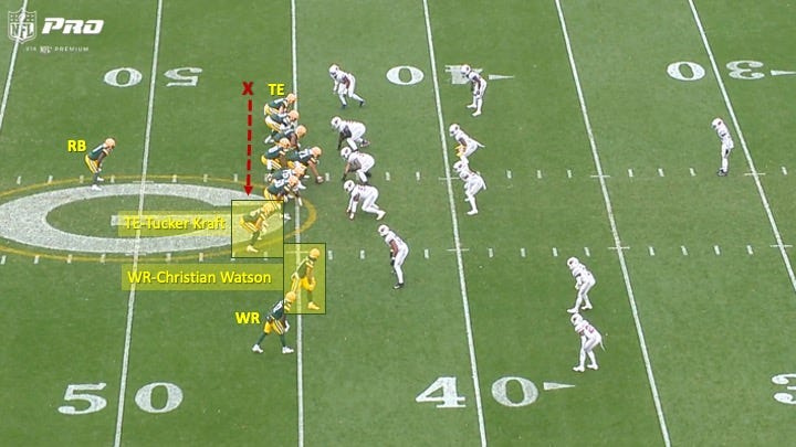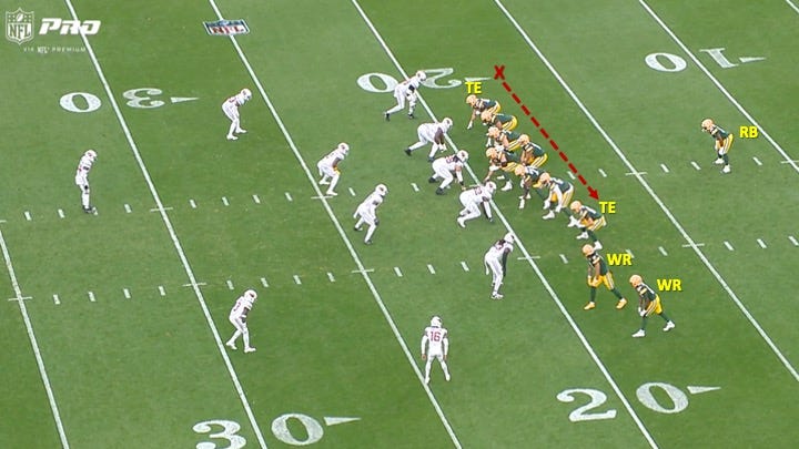 He showed all of the pre-snap elements we saw on the previous two plays. It was the same down and distance. The Packers were in 12 personnel again (the Cardinals would match up in base like they did on the first possession). Tucker Kraft would motion across the formation to create a closed 1x3 formation. And Christian Watson was the #2 receiver to the strong side: