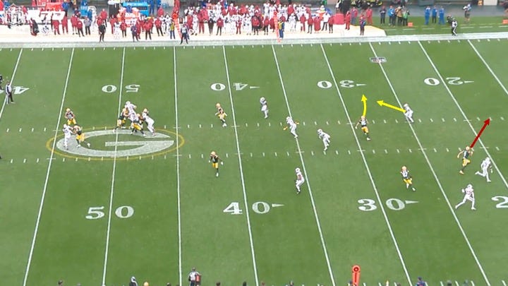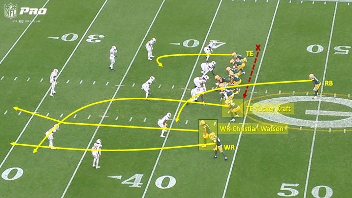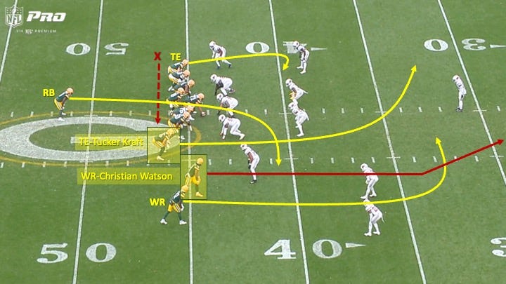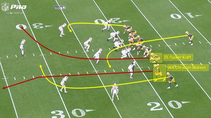 A few plays later, the Packers would come out in the same personnel grouping and motion to the same formation on first down. This time, they would run a “Sail” concept out of it, with Kraft taking his route to the sideline and Watson running a deep post: