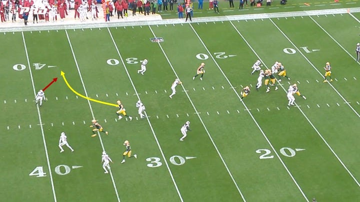On this first example from a Week 6 game against the Cardinals last season, LaFleur did this brilliantly, using what he saw from Arizona’s defense early in the game to dial up a 44-yard touchdown pass that gave Green Bay a commanding 24-0 lead.