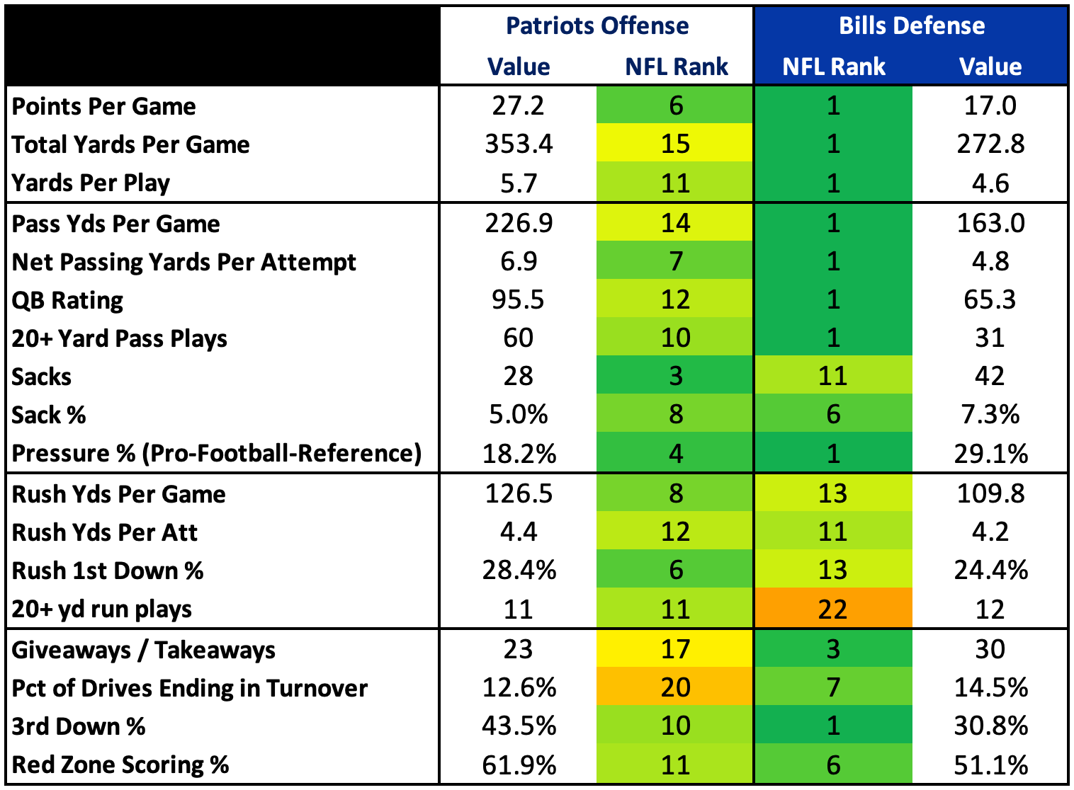 The Patriots want to align in big personnel packages and force Buffalo’s defense out of Nickel (which it predominantly plays). Then they want to run the ball and mix in play-action. They can do that as long as the game stays close. If they get into a situation where they have to lean on the passing game, though, they’re in trouble. This is especially true given the expected weather conditions.