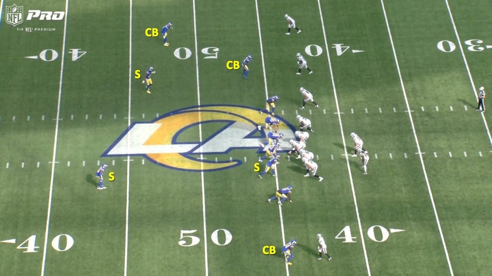 This play from Chris Shula’s Rams Defense in their Week 7 win against the Raiders was a great example of this. First, notice that the Rams were in dime personnel (6 DBs) to get more speed on the field: