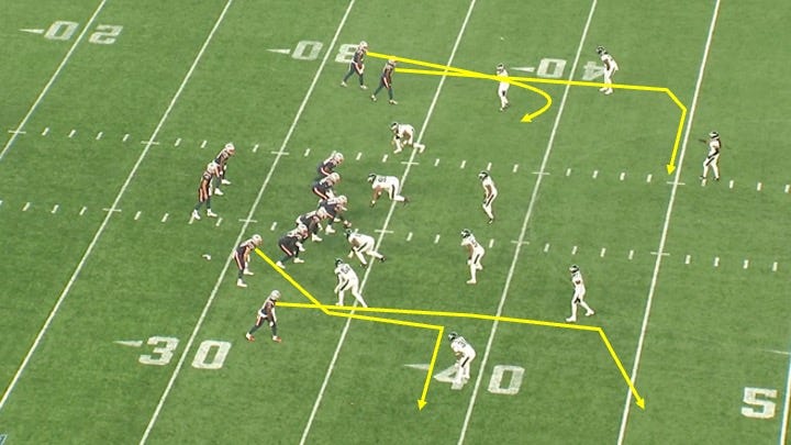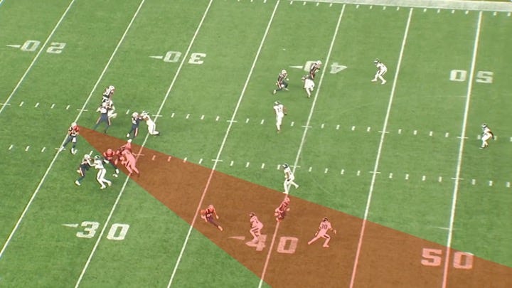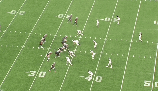 This first play was probably Maye’s best of the night, a 3rd-and-5 on his initial drive. The Patriots had a corner-out combination called to the right and a curl/wrap-in (or spin-dig) to the left: