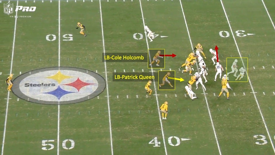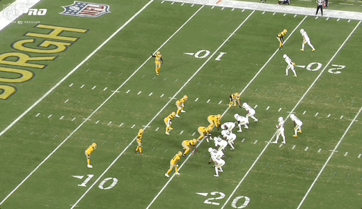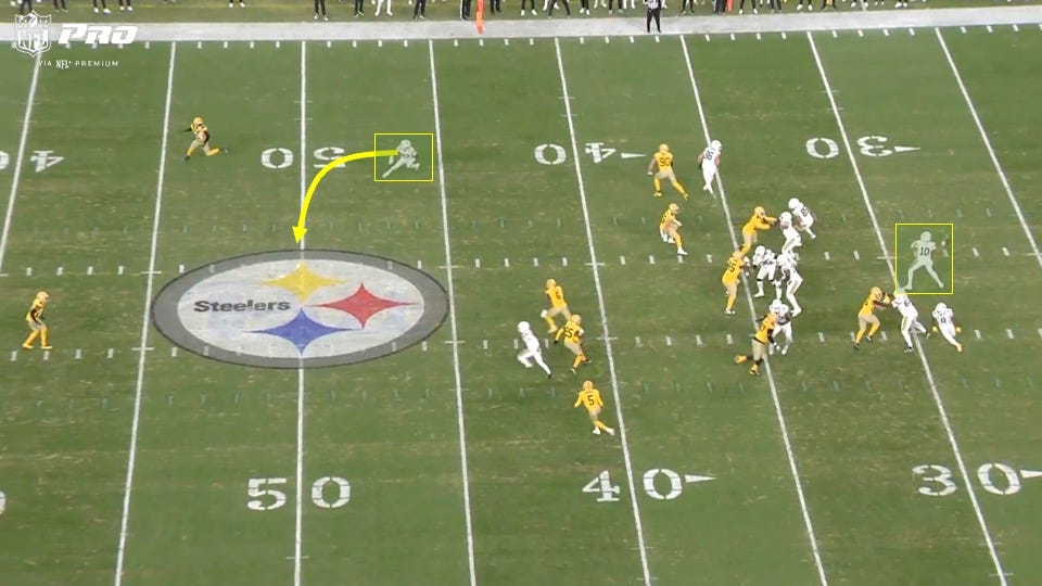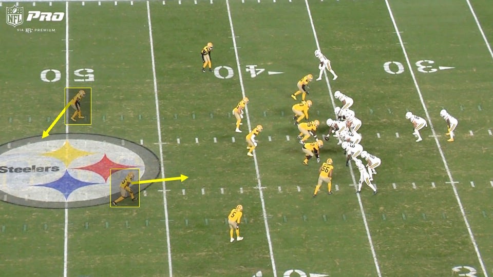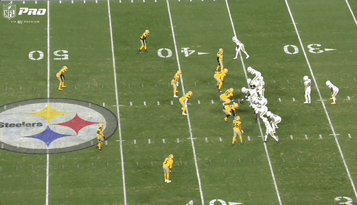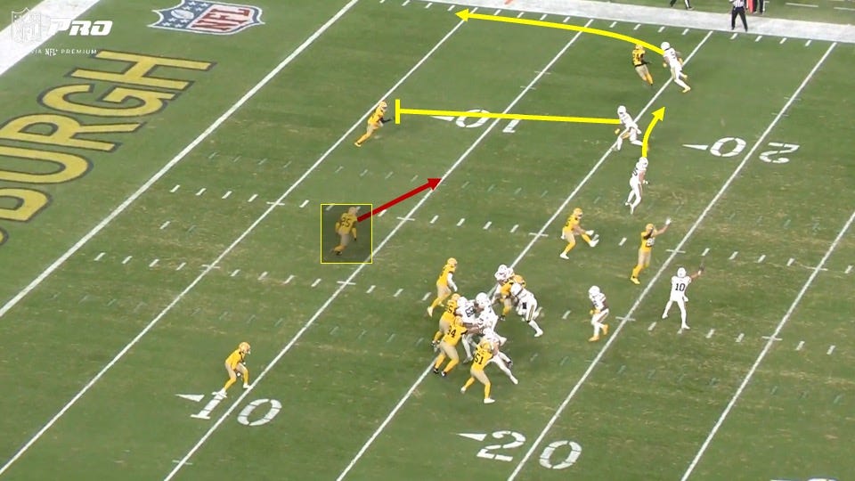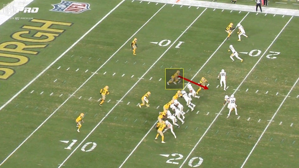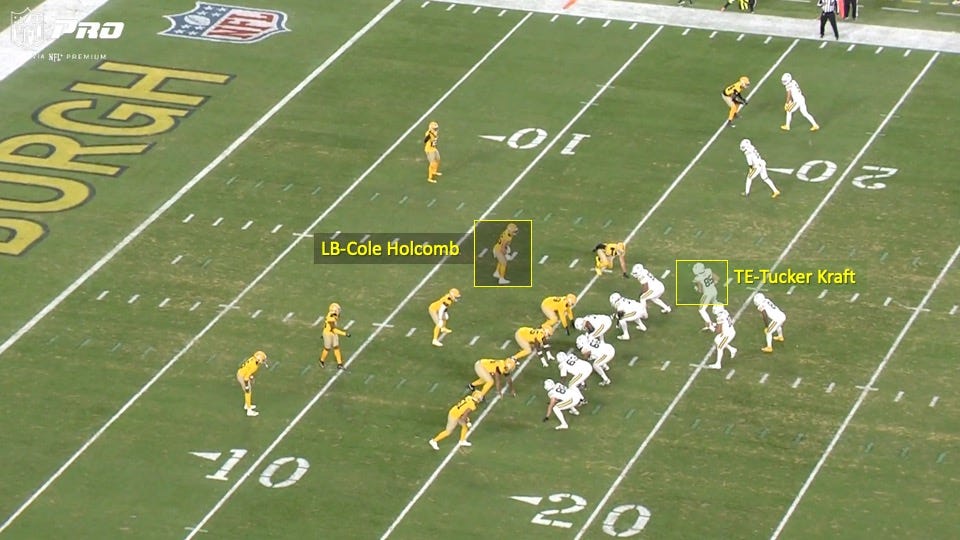 When Kraft motioned, no one on the Steelers went with him. This was either a mistake, or Pittsburgh wanted the Packers to think that the third defender to that side who would account for Kraft would be Cole Holcomb (or perhaps that they’d be dropping out into zone):