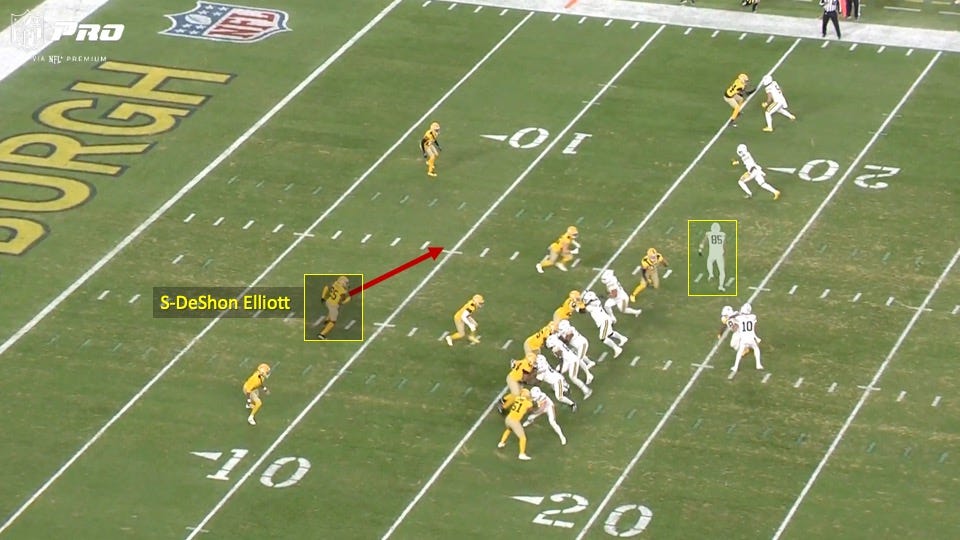 The defender who should have been over there was safety DeShon Elliott. Again, this might have just been a mistake or a miscommunication, but it looked to me like he was purposefully late in getting over in an effort to help disguise the blitz: