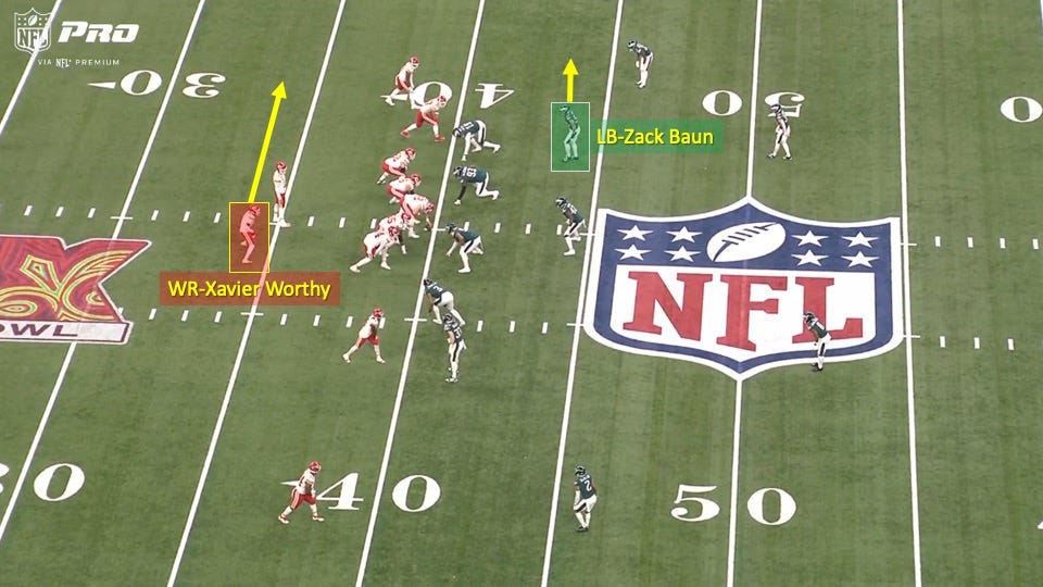 The Eagles were playing quarters coverage. That left linebacker Zach Baun pushing with his motion and then locking on:
