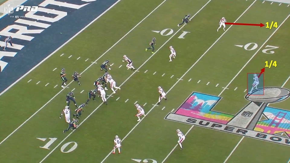 But this wasn’t traditional quarters coverage. This was Cover-4 Palms (Cover-2 Trap). Cornerback Carlton Davis would jump JSN’s route as soon as he saw him break outside, and Hawkins would race over the top to take Shaheed’s go-route: