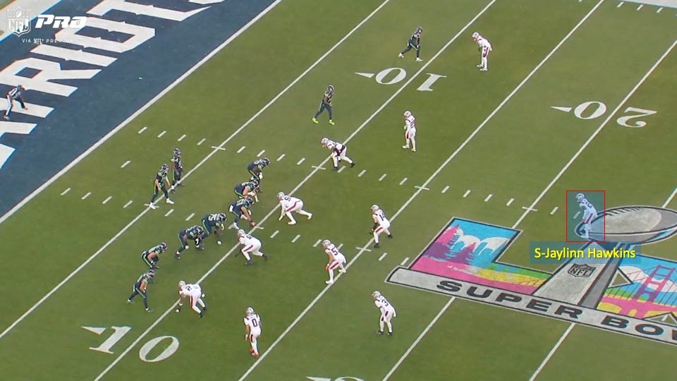 Here’s one more example of the Patriots trying to hide their intentions in coverage. Craig Woodson (#31) would end up being the deep-middle safety on this play. However, he started the snap just 4 yards from the line of scrimmage: