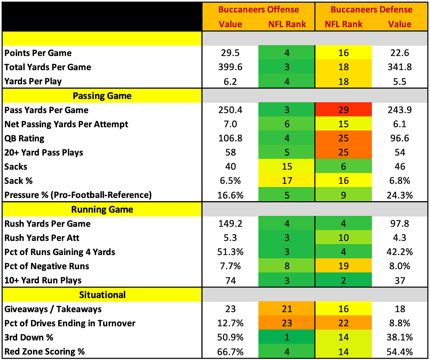 We all know about Mike Evans, Chris Godwin, and the passing game in general, but the running game was also surprisingly good behind a steady offensive line and the emergence of rookie running back Bucky Irving. Tampa finished 4th in rushing yards, 3rd in explosive runs (10 yards or more), 6th in yards before contact and 2nd in yards after contact.