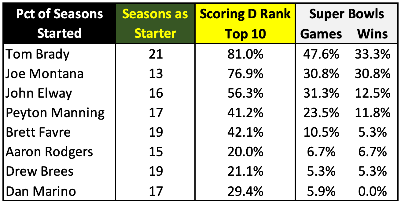 We can also look at this on a percentage basis. Below is the percentage of seasons each quarterback had a top-10 scoring defense, as well as the percentage of seasons each played in or won a Super Bowl: