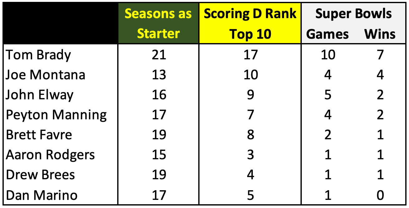 Below, I’ve put together a list of some of the best quarterbacks to ever play the game (with more than 10 seasons as a starter under their belt, so no Mahomes for now), as well as how good their defenses were at preventing points. The columns show the total seasons each had as a starting quarterback, how many of those seasons their defense ranked in the top-10 in points allowed, and then the number of Super Bowl appearances and wins they had: