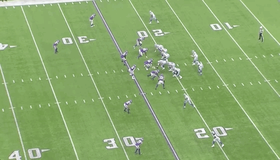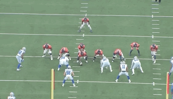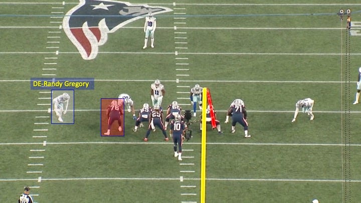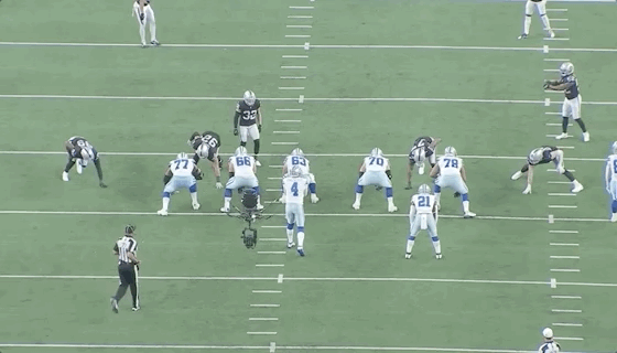 This also ensured that the running back couldn’t chip Randy Gregory, aligned in a 1-on-1 matchup off the edge: