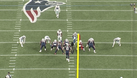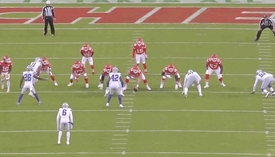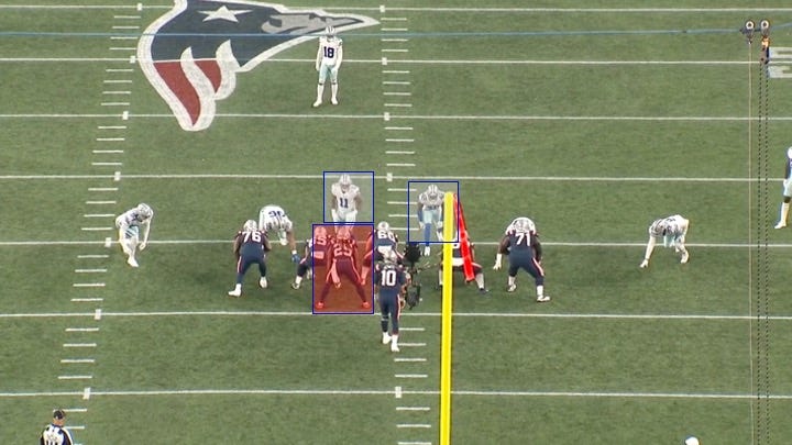 Here, the Cowboys showed a pre-snap double-A-gap pressure look against the Patriots. That got the running back to creep up towards the line of scrimmage before the snap so he could help out on one of the potential A-gap blitzers and block him away from the quarterback: