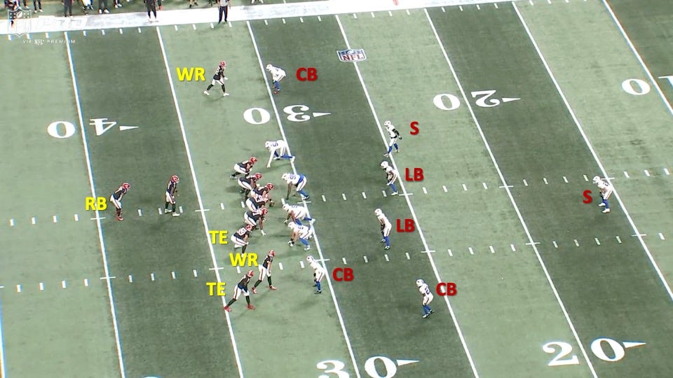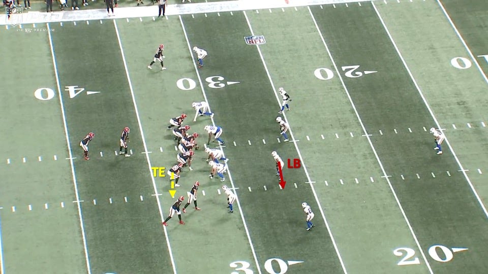 With two tight ends as a part of that bunch, the Bills had to honor it with at least one linebacker. And that left their resulting 6-man box light, with 4 down-linemen, 1 linebacker, and a safety to the weak side: