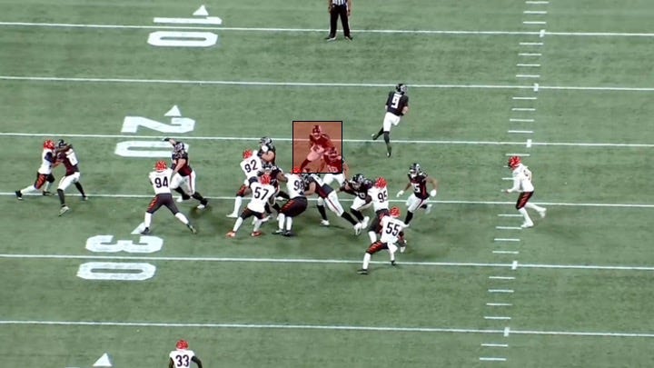 The vision and quickness in confined spaces is immediately apparent. There are not that many backs who can turn nothing into something like that. Here’s a still shot from the moment right after Robinson got the ball. Does it look like this will be a 12-yard run?