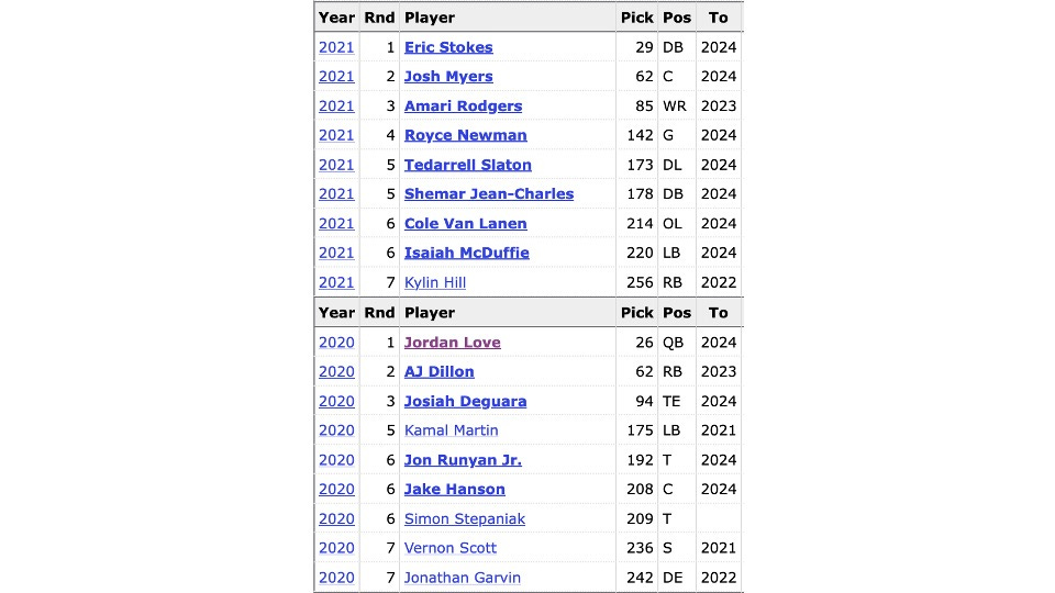 For all the money they saved by not participating in free agency, and for all the picks they saved by not being aggressive, and for all the decisions Green Bay made during 2020 and 2021 to make sure they were well positioned after Rodgers… Jordan Love and Isaiah McDuffie are the only players from those drafts that are still on the Packers in 2025.