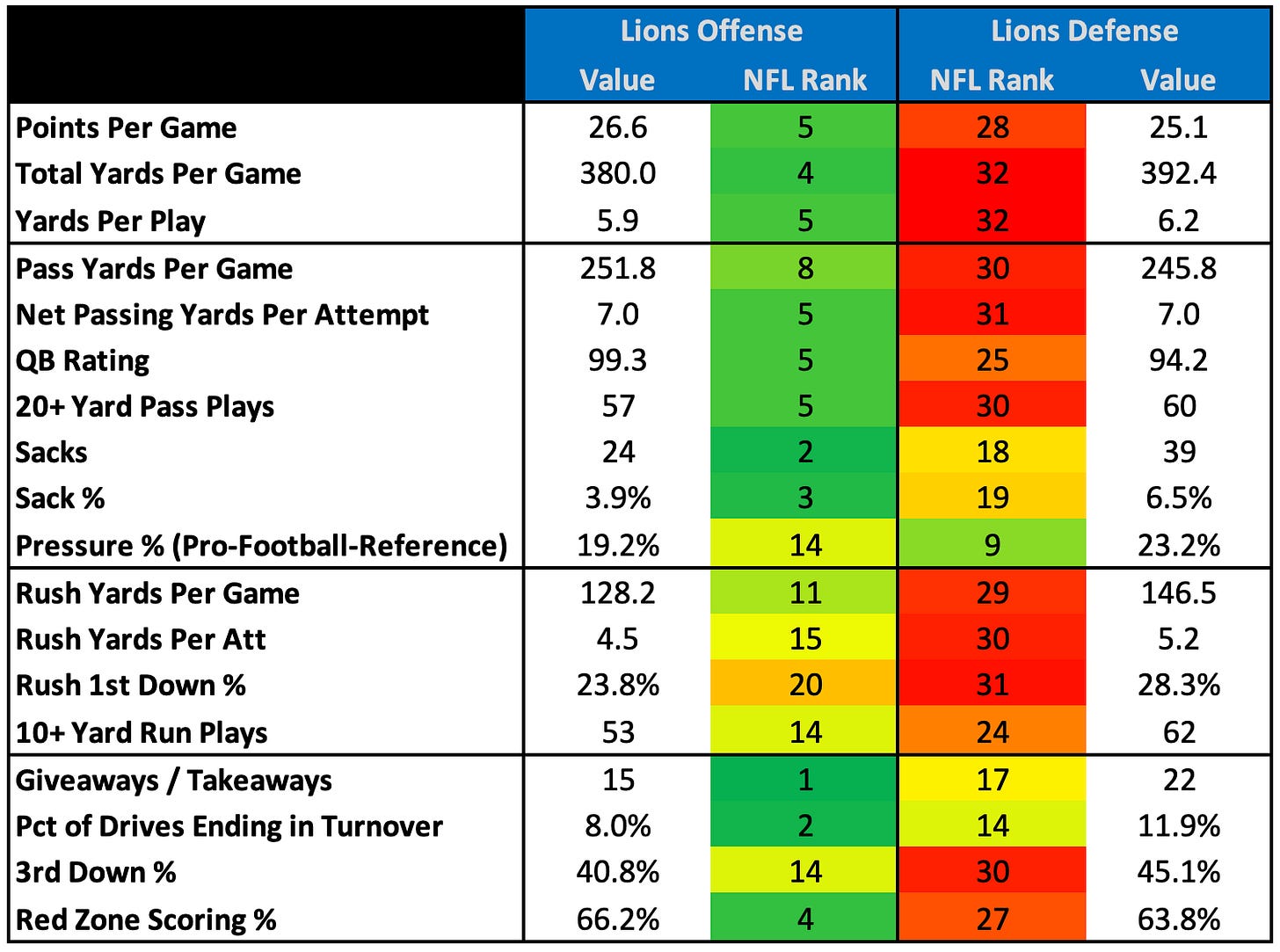 Before we officially move ahead into this season, here’s a look back at the Lions’ team stats and NFL rankings from 2022: