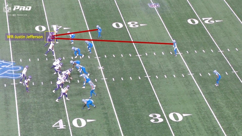 This first play was a 3rd-and-9 on the Vikings’ second drive of the game with the score tied at 7. Minnesota came out in a trips bunch to the left with Justin Jefferson aligned in the middle of the bunch. The Lions responded by playing cover-1 (man) and doubling Jefferson: