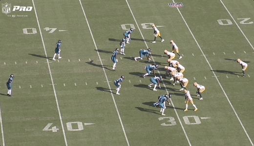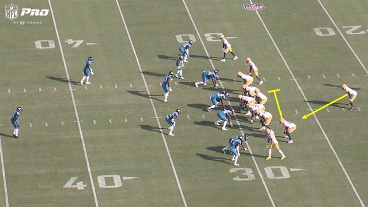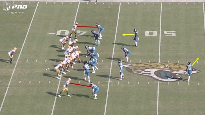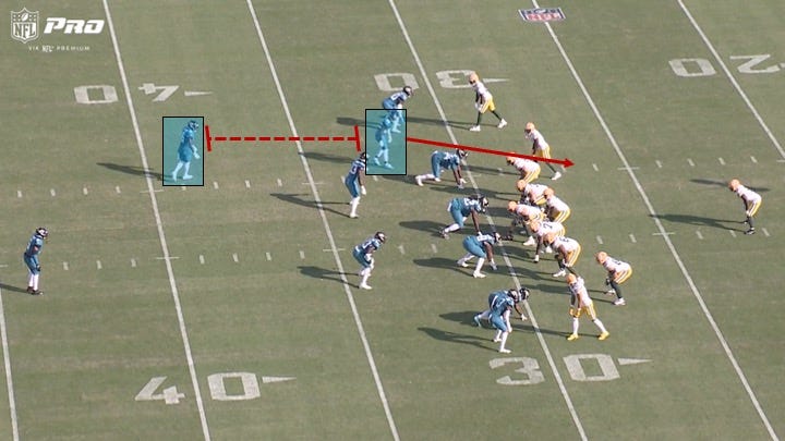 Below you can see that the Jaguars had the safety stacked over the nickel to the right, a good pre-snap indicator of a potential blitz. And that would have disrupted the boot: