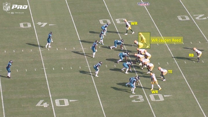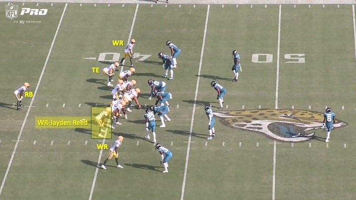 Below was the “keeper” LaFleur was referring to that the Packers had run in the third quarter. First, note the look. Green Bay was in 11 personnel, had tight splits to both sides, and Jayden Reed was aligned just off tackle to the right side of the formation:
