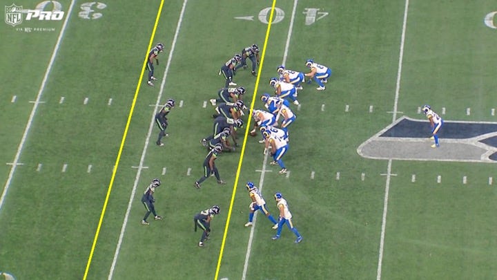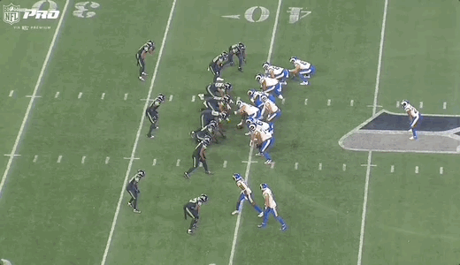 So Head Coach Mike Macdonald dialed up a cover-0 all-out blitz. All 11 defenders would align within 5 yards of the line of scrimmage pre-snap: