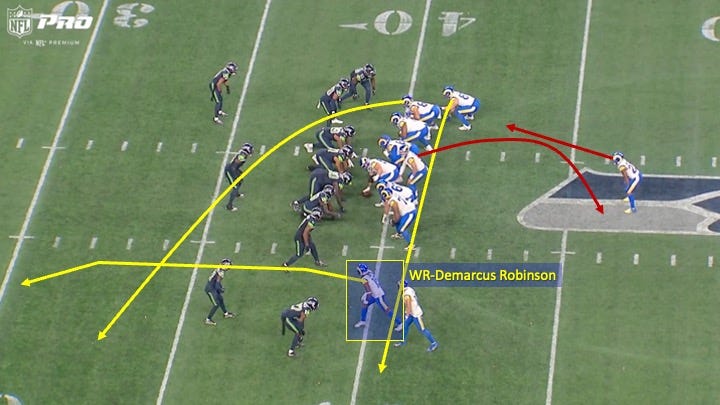 In response, McVay called a play-action boot to the left with Demarcus Robinson running a corner route as part of a 3-level-stretch concept: