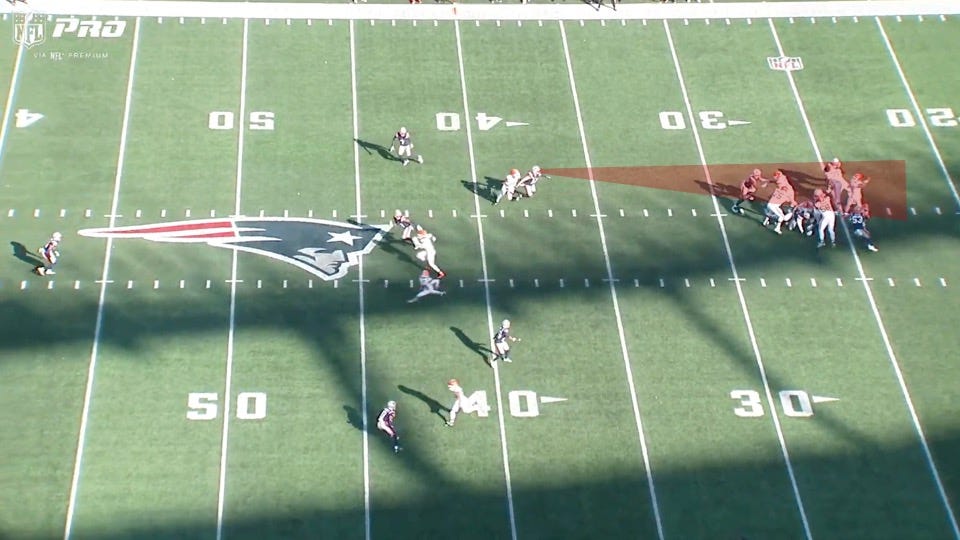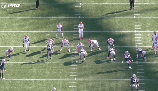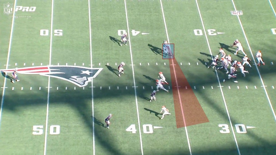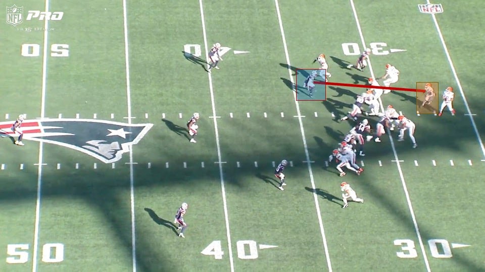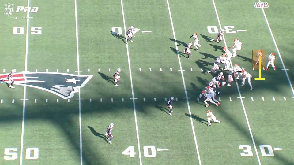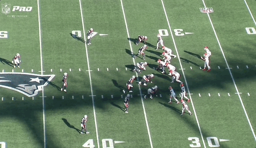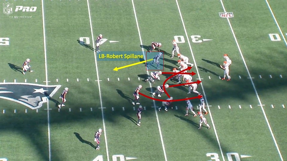 The Patriots would bring a blitz and rush 5. Linebacker Robert Spillane, who started the play on the line of scrimmage, dropped out into coverage: