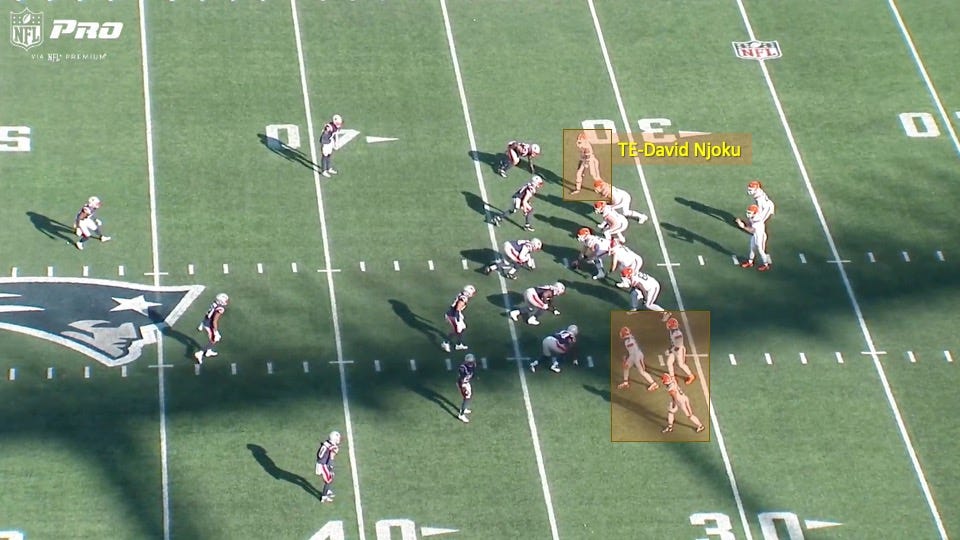 On this play, the Browns faced a 3rd-and-7 from their own 33-yard line in the middle of the 3rd quarter. They came out in a 1x3 formation with a bunch to the left and tight end David Njoku to the right: