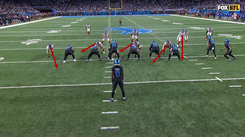 The Giants would bring a blitz to the right where the run was designed to go. Their D-line slanted right-to-left as a part of the pressure: