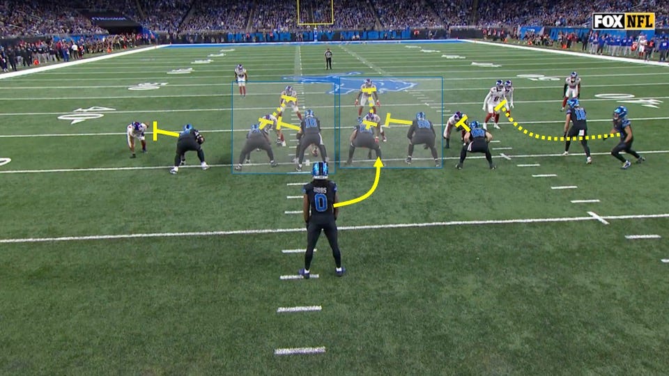 First, notice center Graham Glasgow. He was initially supposed to double the nose tackle to his left up to the linebacker: