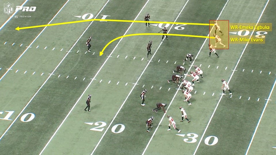 The Buccaneers went with an empty formation and had Mike Evans and Emeka Egbuka aligned next to each other. You can see the route combination illustrated below: