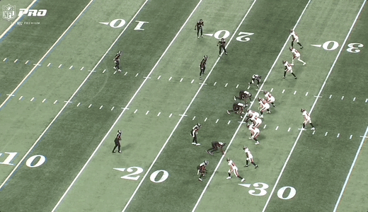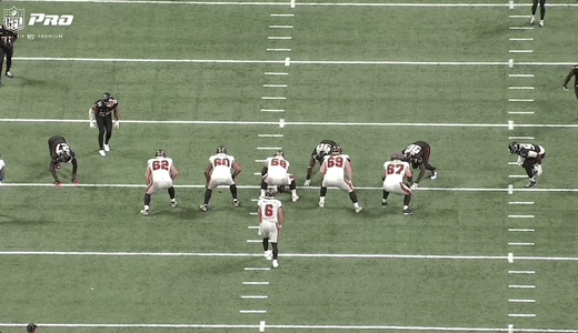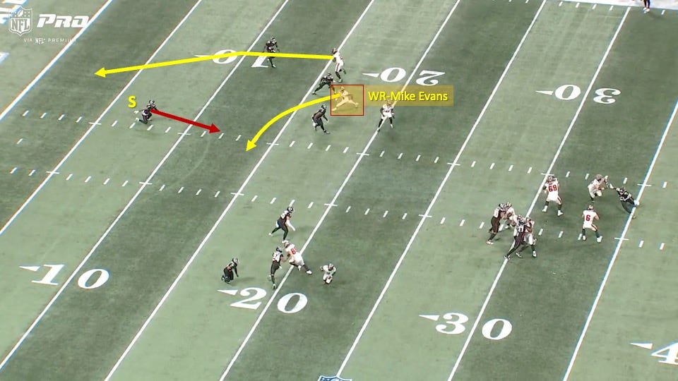 While Egbuka’s post would end up being the target on the play, it was set up by Mike Evans. As Baker Mayfield said afer the game: “Mike (Evans) draws a lot of attention. He got the safety to bite down on it.”
