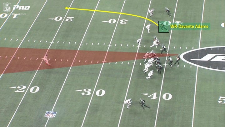 Rodgers described exactly how the Jets were able to create conflict for the defense: “Backside, we got Garrett […]. He’s running a double move. He’s running a slant-and-go:”