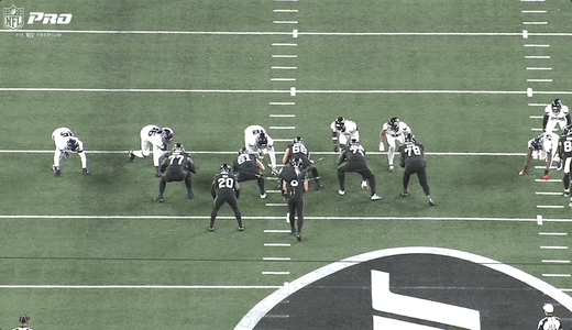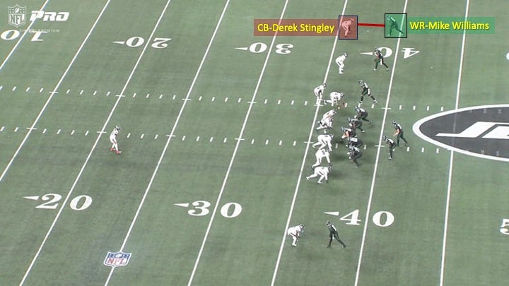 The Jets would align in a 3x1 formation on this play and the Texans would match up in a cover-1 (man-free) pressure look: